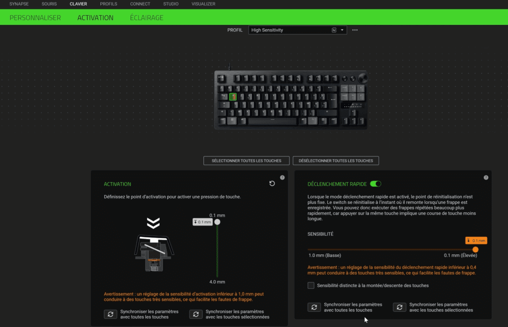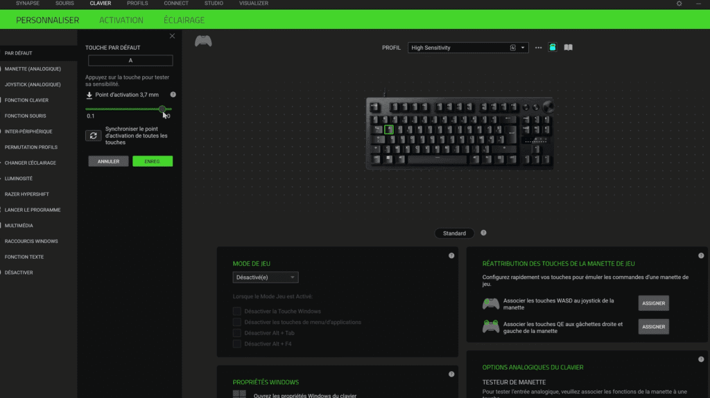Le logiciel Razer Synapse permet de configurer la course d’activation des touches, d’attribuer des macros et de créer plusieurs profils en fonction des jeux ou applications utilisées.